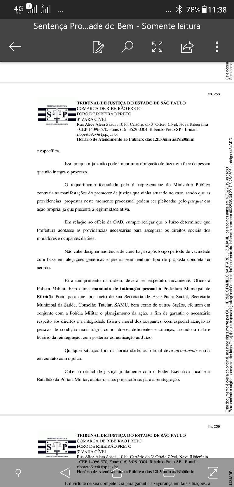 Em sentença proferida no último dia 18 de fevereiro, o juiz Dr. Guilherme Stamilo Santarelli Zualiani negou tanto a suspensão da reintegração de posse como a audiência de conciliação entre as partes. Para tal, o juiz alegou no documento que “não cabe designar audiência de conciliação após longo período de vacuidade com base em alegações genéricas e pueris”. Para o magistrado, não existe “nenhum tipo de proposta concreta ou acordo”.
